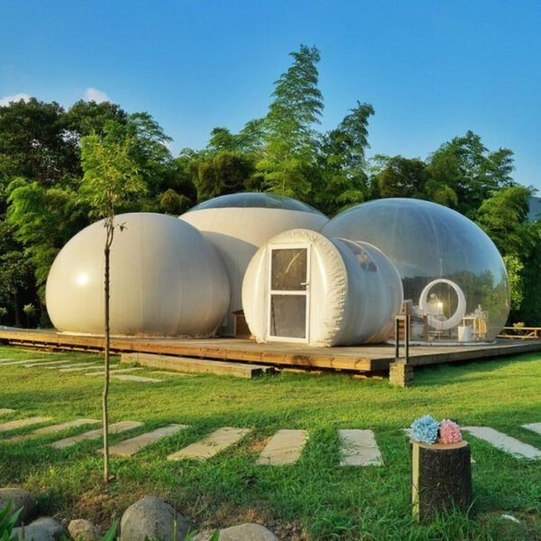 La tente bulle gonflable transparente répond aux besoins des porteurs de projets d’hébergement insolite, de glamping ou d’espaces événementiels en plein air. Sa paroi en PVC transparent offre une immersion visuelle totale de la nature environnante, tout en assurant une protection efficace grâce à son indice d’imperméabilité de 2000 à 3000 mm. La structure en arceaux d’alliage d’aluminium garantit une tenue stable face au vent, tandis que le sol intégré en PE complète l’isolation du volume intérieur. Avec un poids de 80 kg et une taille de 5 m de diamètre, ce type d’installation se destine à un usage semi-permanent ou saisonnier sur un terrain aménagé. Pour compléter votre projet d’hébergement outdoor, découvrez également notre sélection de tentes bulles transparentes et nos tentes de camping 4 saisons.
